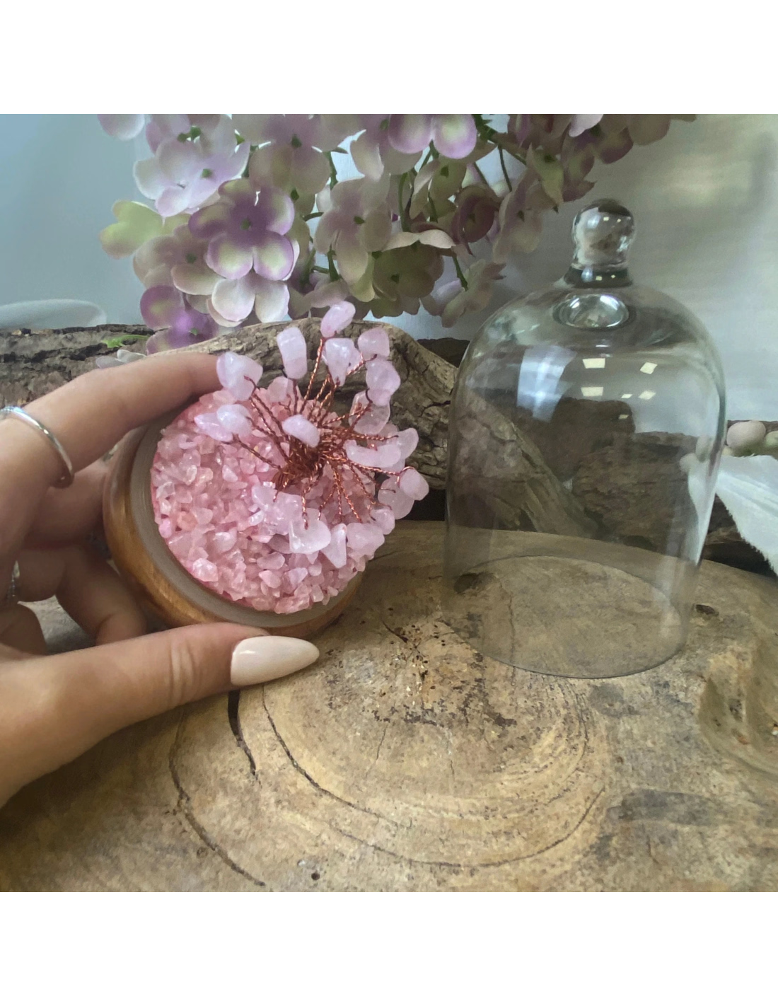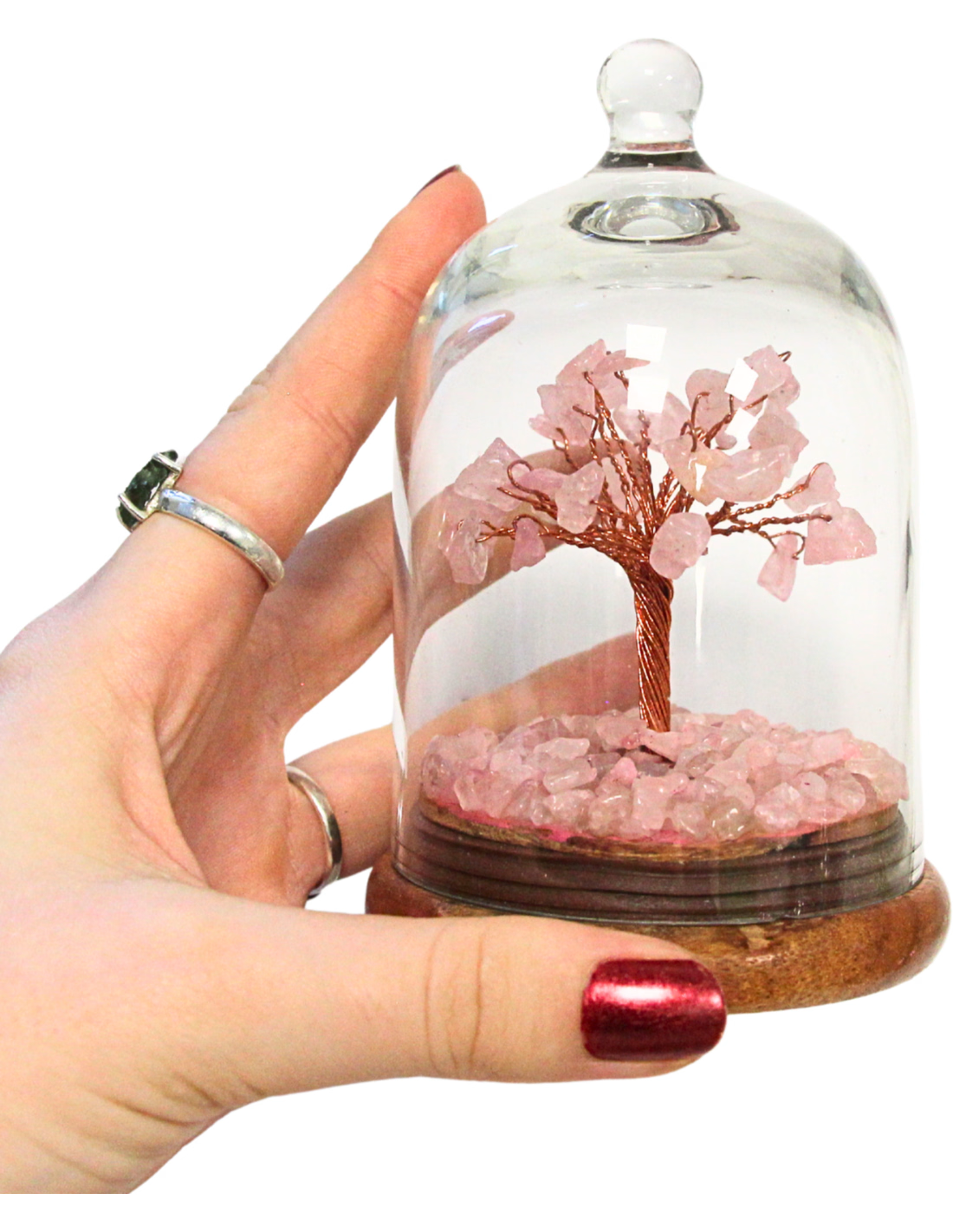 Rozenkwarts edelsteen boompje onder glazen stolp