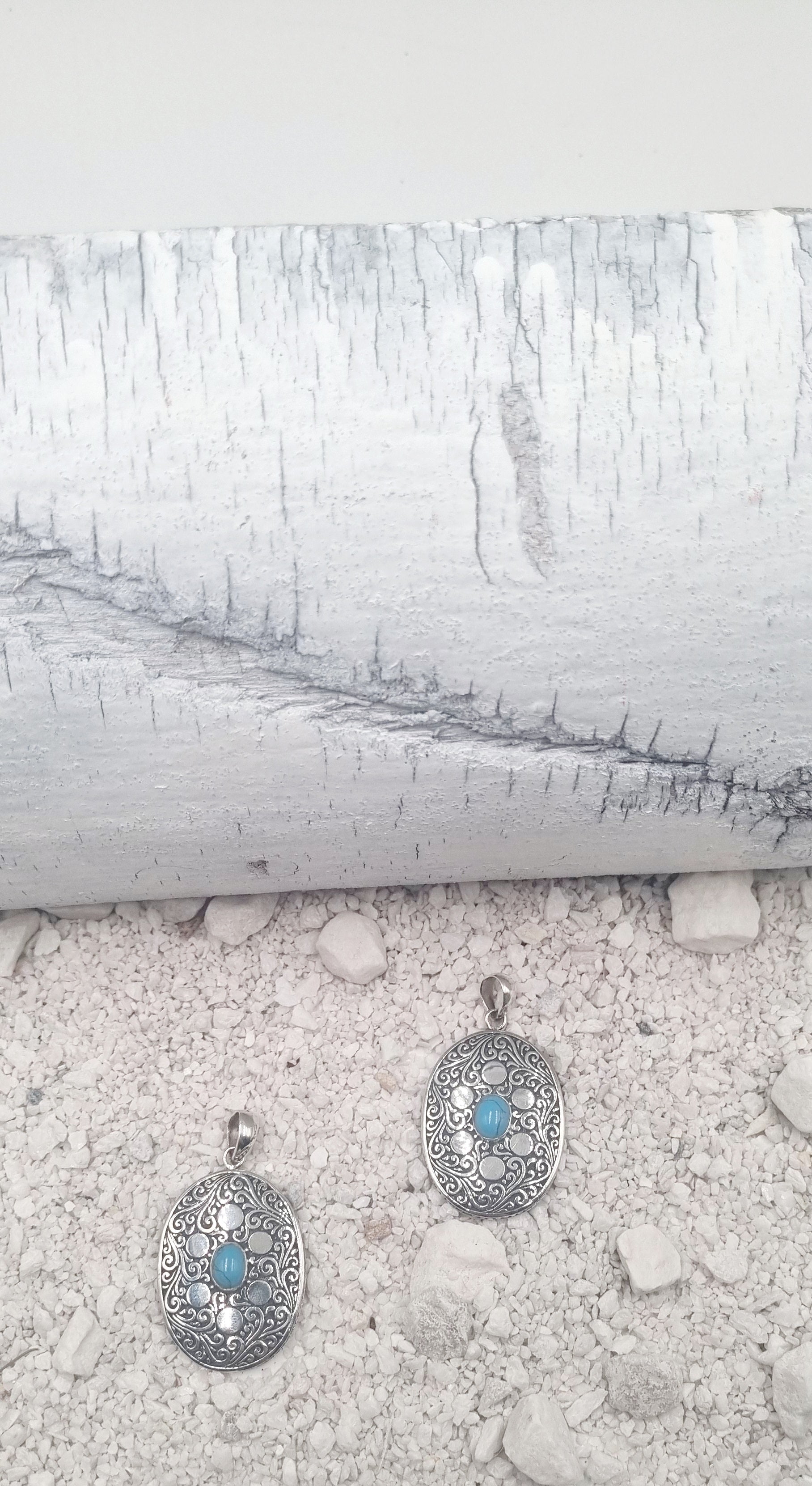 Ontdek de betoverende schoonheid van deze zilveren ketting met hanger, recht van het spirituele eiland Bali . De hanger is versierd met een schitterenden turkooizen steen, bekend om zijn diepblauwe tot groenblauwe tinten en zijn rijke geschiedenis van spirituele betekenis. Turkoois wordt eeuwenlang vereerd in diverse culturen, waaronder die van Bali, als een steen van bescherming, wijsheid en welzijn.